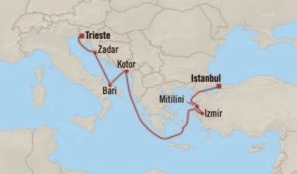 Ports of call include: Istanbul (Turkey), Mitilini (Greece), Izmir (Turkey), Kotor (Montenegro), Bari (Italy), Zadar (Croatia), Trieste and Venice (Italy)